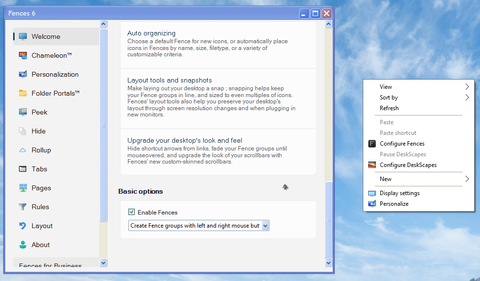 After some time delay, right clicking the Windows 11 Desktop and selecting 'Personalise' from the Context Menu results in the opening of the Fences Settings page with the 'Welcome' page being displayed. A reboot will temporarily resolve the issue only for it to come back some time later.