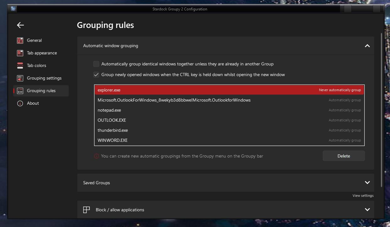 Sorry to hear you are having issues. From what I know there is not one setting to group any open Windows. But you can add specific application to group automatically. Also, you can set to auto group any opening Windows while pressing the CTRL key down.